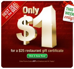 Restaurant.com currently has a torpedo deal on their gift certificates. You can measure a $25.00 Gift Certificate for usually $1.00. Simply make use of formula JOY during checkout!! This deal really makes me JOYFUL!